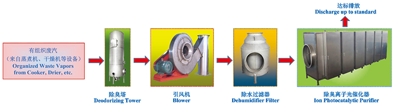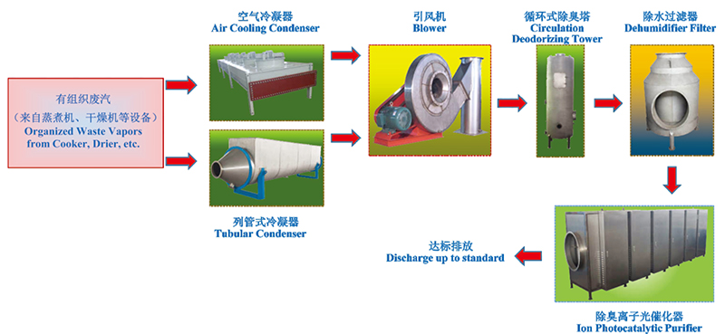 針對魚粉工廠的實際工作情況,我們將廢汽分為兩大類,即有組織廢汽和無組織廢氣。所謂有組織廢汽就是來自蒸煮機(jī)、干燥機(jī)等設(shè)備在生產(chǎn)過程中產(chǎn)生的大量水蒸氣,該廢汽的特點是溫度高達(dá)95C以上,且濃度相當(dāng)高。無組織廢氣是指來自原料池、生產(chǎn)車間及倉庫的有味氣體,該氣體的特點是濃度較低,溫度也不高,但氣量相當(dāng)大。根據(jù)客戶工廠的選址情況及具體條件,我們將有組織廢汽處理工藝分成兩種配套方案,以下是針對這兩種廢汽處理配套方案的工藝說明及流程方框圖。