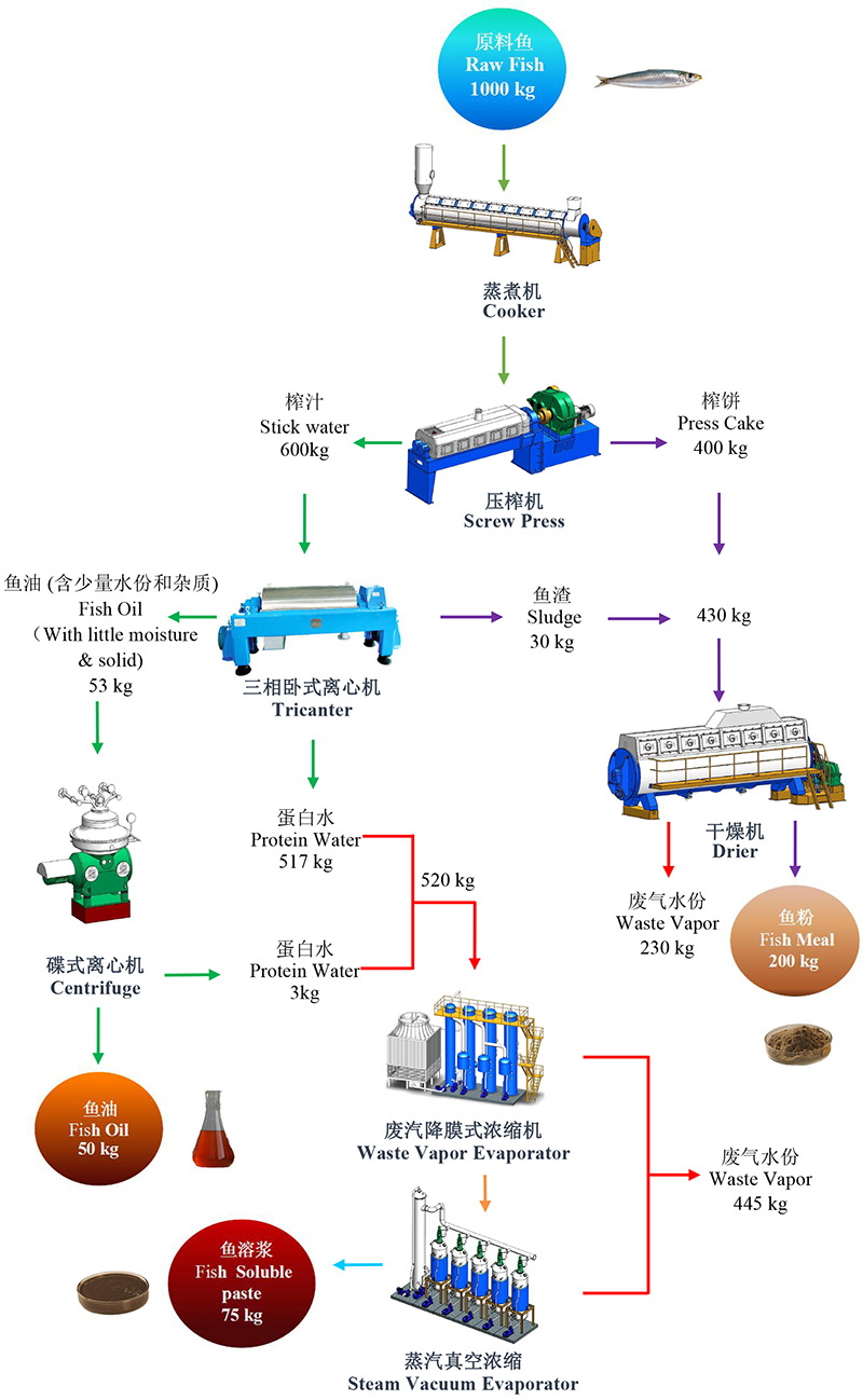 我們可以根據(jù)客戶的投資規(guī)模,工廠選址,環(huán)保要求等條件,為其選擇更好的工藝方案。現(xiàn)以第4種生產(chǎn)線配套方案為例作簡(jiǎn)要介紹,同時(shí)結(jié)合相應(yīng)的工藝流程圖及物料平衡圖,供客戶參考。物料平衡圖中的數(shù)據(jù),尤其是魚(yú)油的得率,會(huì)因原料魚(yú)種類及其捕獲季節(jié)的不同而有所變化。